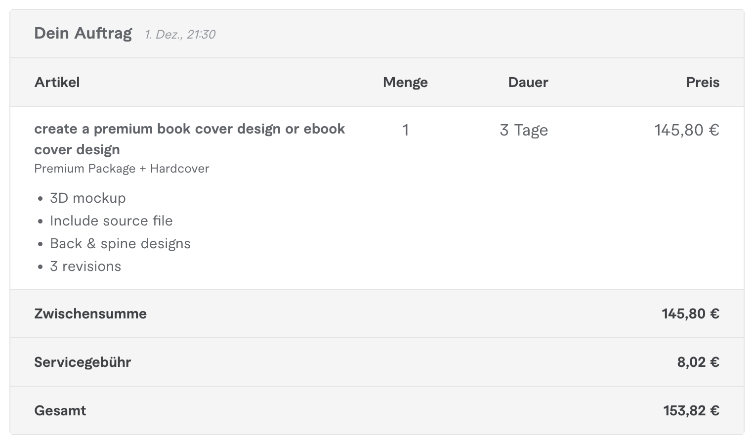 Die am besten bewerteten Verkäufer haben gewöhnlich die höheren Preise, neue Verkäufer bieten ihre Dienstleistungen günstiger an. Ich würde dir empfehlen, auch bei Design-Anfängerinnen zu schauen. Vielleicht gefallen dir ihre Designs. Auch Anfängerinnen können tolle Buch-Cover gestalten!