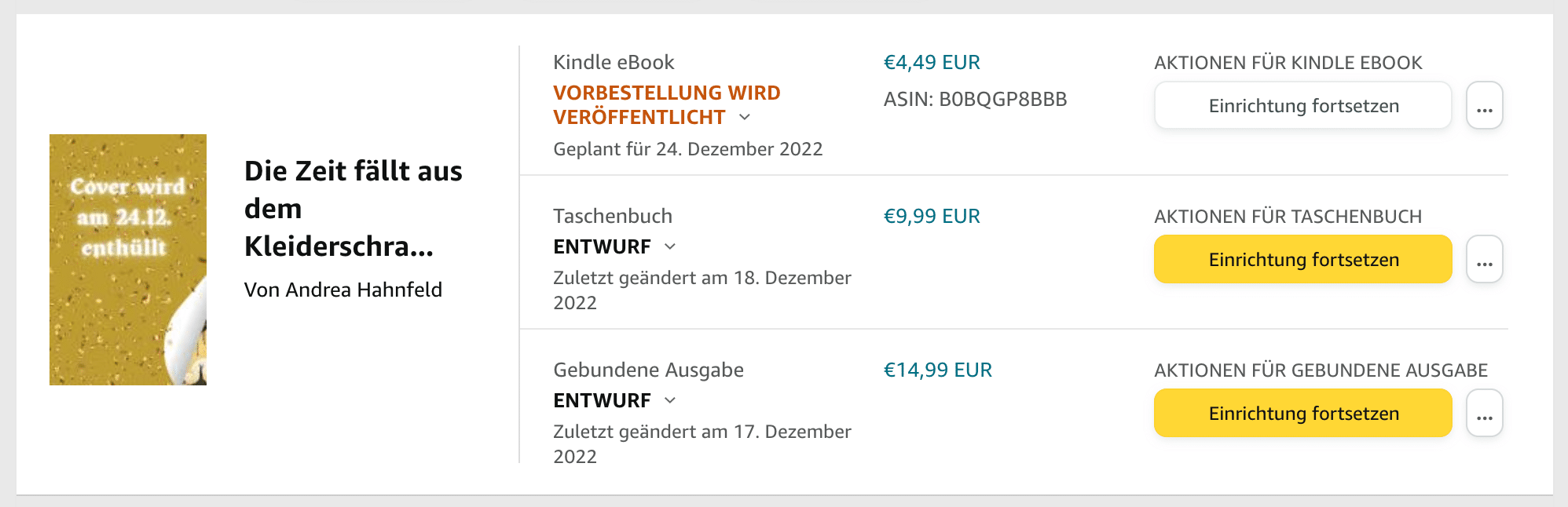 Mit diesem Cover habe ich dann die Veröffentlichung des E-Book zum 24.12.2022 geplant. Das Veröffentlichungsdatum von Taschenbuch und gebundener Ausgabe können derzeit auf Amazon KDP noch nicht geplant werden, deshalb habe ich für diese Formate die Veröffentlichung so vorbereitet, sodass sie zeitgleich mit dem E-Book erscheinen können.