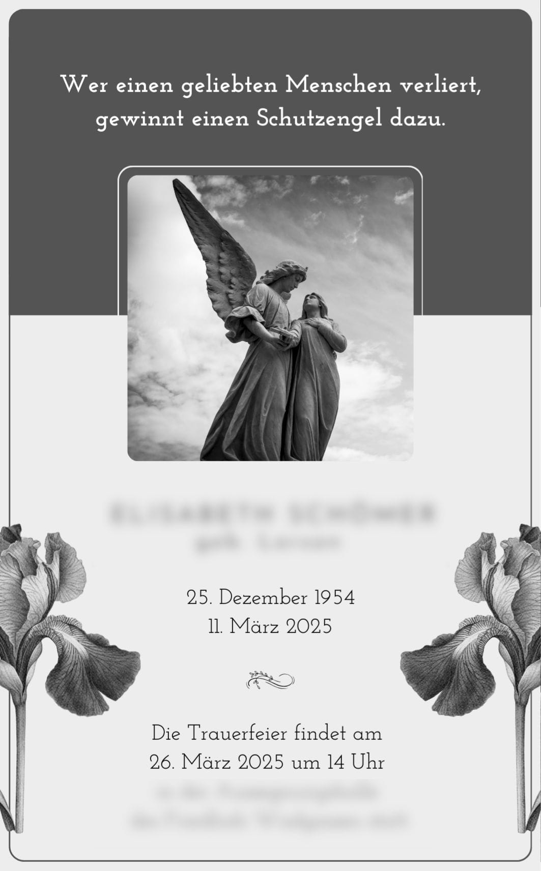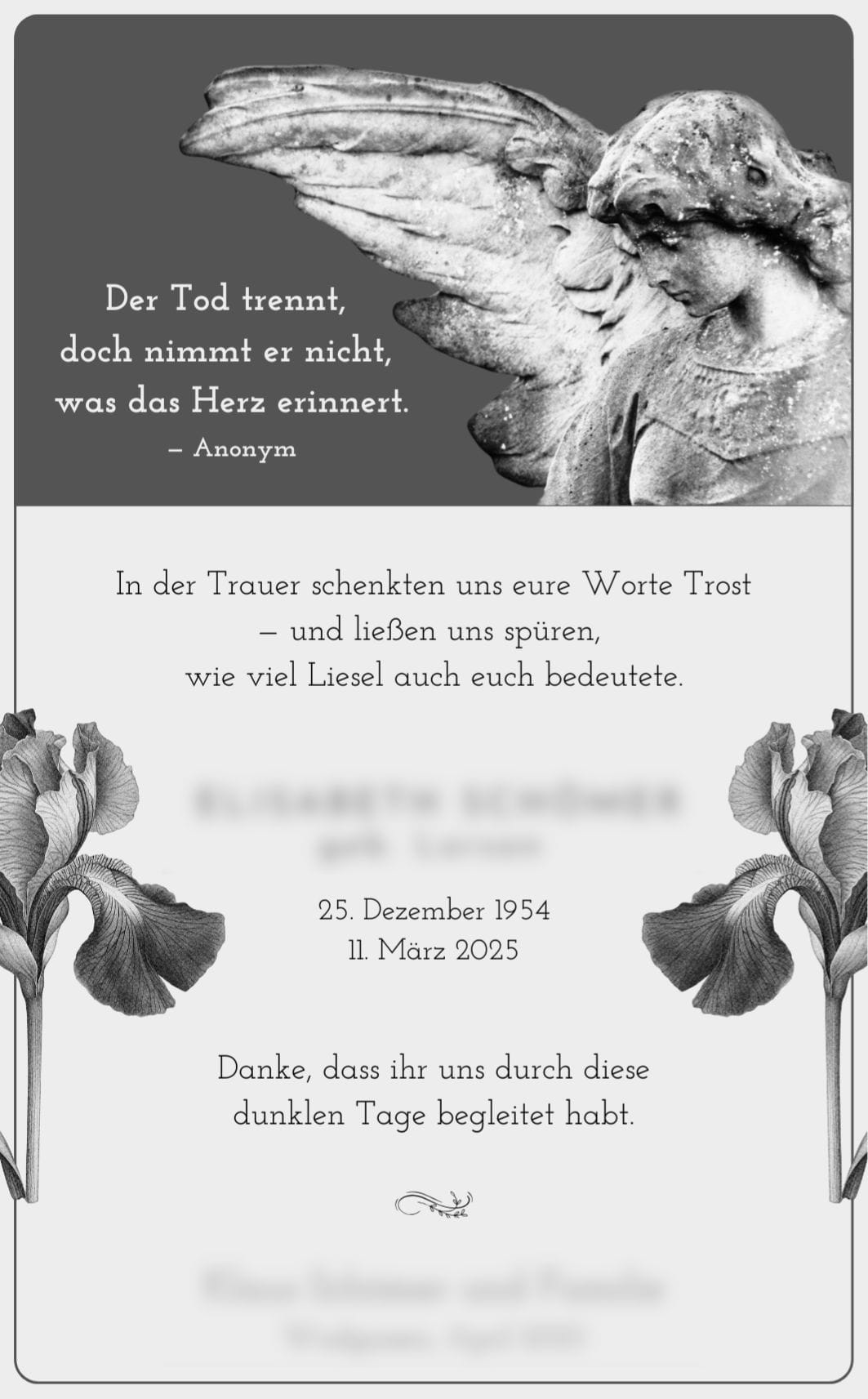 Mein Anteil an der Beerdigung war, dass ich die Todes- und Dankesanzeigen für meine Schwiegermutter gestaltete – schlicht und edel, mit vielen Engeln. So, wie sie es sich gewünscht hätte.