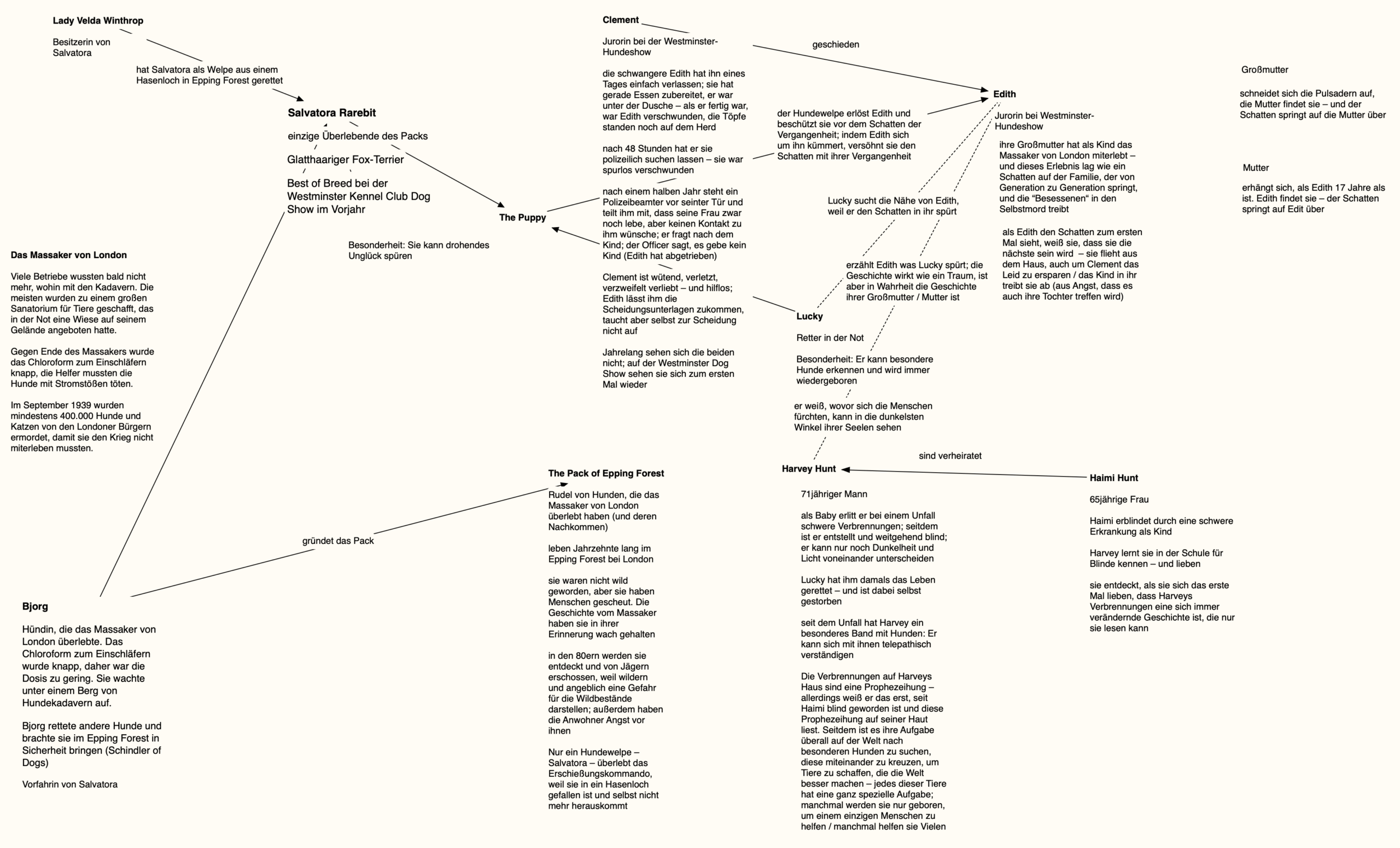 Im Folgenden zeige ich dir wie meine Mindmap zur Geschichte ausgesehen hat. Mir helfen visuelle Mittel dabei, komplexe Zusammenhänge besser zu verstehen. Gerade die Verbindungen zwischen Figuren habe ich gern bildlich vor Augen, ehe ich mit dem Schreiben beginne. Bei meinen Geschichten verschaffe ich mir daher mit Mindmaps den nötigen Überblick. Diese vorliegende Mindmap habe ich übrigens mit dem Programm Scapple erstellt. Kleiner Mindmaps mache ich dagegen lieber mit der Hand.